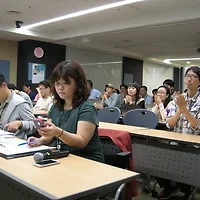 저녁 6 30분에는 깜짝 기획이 펼쳐졌다. 김영찬 씨의 다음인들에게 보내는 연주 영상 촬영이 급작스럽게 준비된 것이다. 아르꼼 팀과 다음커뮤니케이션 기타동 분들 소수만 멀티홀에 몰래 모여서 연주를 위한 이미지를 다운받고, 조명을 껐다 켰다 하며 나름의 연출을 시도하면서 다음인들에게 선물 메세지를 보내는 상황을 즐겼다.
