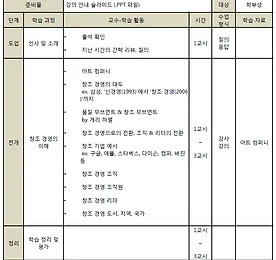 1. 학습목표 창조경영이 대두되고, 해외 및 국내의 다양한 기업들이 창조경영으로의 전환되는 사례들을 알아보도록 한다. 2. 학습성과 창조경영의 다양한 사례를 통해 조직, 조직원, 리더 뿐만 아니라 도시, 지역, 국가에 대한 사고의 확장을 넓힐 수 있다. 3. 주요 학습 내용 도입 보조자료 1) 출석 확인 2) 지난 시간의 간략한 리뷰 및 질의응답 시간 전개 보조자료 1) 아트 컴퍼니 2) 창조경영의 대두 3) 품질 무브먼트 & 창조 무브먼트 by 게리 하멜 4) 창조경영으로의 전환, 조직 & 리더의 전환 5) 창조기업 예시 ex) 구글, 애플, 스타벅스, 다이슨, 캠퍼, 버진그룹 등 6) 창조경영 조직 7) 창조경영 조직원 8) 창조경영 리더 9) 창조경영 도시, 지역, 국가 아트 컴퍼니 종결 1) 요약..