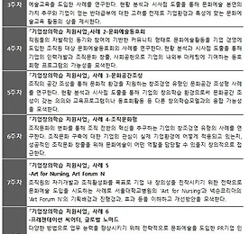 교육과정개발사업/[한예종] 기업과 문화예술 I 썸네일형 리스트형 한국예술종합학교 '기업과 문화예술' 교과목 개요 교육 목표 문화예술의 가치를 기업에 접목시키는 창의학습모델 개발을 통해 기업을 위한 핵심역량 개발에 새로운 대안을 창출, 보급, 확산하고자 하는 「기업창의학습 지원사업」 연계 수업으로 문화예술교육 프로그램의 실행과정에서 학생들이 직접 다양한 기업들을 방문하여 예술과 기업의 새로운 관계에 대해 토론하고, 이를 통해 학생 스스로 방향을 설계하도록 유도하고자 하였다. 아울러 시범사업이 실행되는 과정을 검토하고 재조명하여 기업과 예술계 양자에게 실익이 되는 지속가능한 기업창의학습 모델을 도출하고자 하였다. 수강 현황 한국예술종합학교 예술경영 전공 전문사생 / 6명 (예술경영 4, 극장경영 1, 한국예술학 1) 강의 내용 및 진행 방식 본 강의는 국내에 다양한 문헌 연구와 더불어, 기업들의 직접적인 도움을 받아 .. 더보기 이전 1 2 3 4 ··· 17 다음
