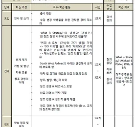 교육과정개발사업 썸네일형 리스트형 [3주차] 창조경영이란 무엇인가? 1. 학습목표 창조경영이 대두된 이유와 창조경영에 대한 정의를 이해한다. 2. 학습성과 학습자 개개인의 관심사와 각 활동 영역을 바탕으로 자발적으로 학습 및 시범 사업의 방향을 설계할 수 있다. 3. 주요 학습 내용 도입 보조자료 1) 출석 확인 2) 수강변경 학생들을 위한 간략한 강의 재소개 전개 보조자료 1) 'What is Strategy?'의 내용과 감상은? 왜 창조 경영 서두에 읽어오라고 했을까? 질문에 대한 학생들의 생각을 자유롭게 토론하는 시간을 가지도록 한다. 2) 커피&도넛 (가상의 자기 상점) 가정 ‘OO 커피’를 들고 우리 ‘커피&도넛’ 가게에 들어온 손님(?!)을 어떻게 할 것인가? 매뉴얼로는 안 되는 ‘창조 경영’의 필요 이유다. 3) South West Airlines의 사례와 .. 더보기 이전 1 ··· 61 62 63 64 65 66 67 ··· 101 다음