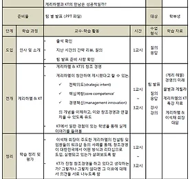 교육과정개발사업 썸네일형 리스트형 [9주차] 게리하멜 & KT 1. 학습목표 - 게리하멜이 주장하는 패러다임의 변화를 이해한다. - KT는 창조경영을 하고 있다고 생각하는지에 대하여 토론한다. - 게리하멜과 KT의 만남은 성공적인지에 대하여 토론한다. 2. 학습성과 게리하멜의 패러다임 변화 개념과 KT의 다양한 창조경영 혁신전략에 대한 사례를 통해 서로의 생각에 대하여 공유하고 이를 이해하는 시간을 가져볼 수 있다. 3. 주요 학습 내용 도입 보조자료 1) 출석 확인 2) 지난 시간의 간략한 리뷰 및 질의 응답 시간 3) 팀 발표 준비 사항 확인 전개 보조자료 1) 게리하멜 & KT의 창조경영 2) 게리하멜이 창안하여 제시했다고 할 수 있는 - 전략의도(Strategic intent) - 핵심역량(Core Competence) - 경영혁신(Management Inn.. 더보기 이전 1 ··· 66 67 68 69 70 71 72 ··· 101 다음