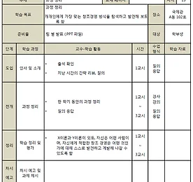 교육과정개발사업 썸네일형 리스트형 [15주차] 과정 정리 1. 학습목표 한 학기 동안의 수업 내용을 정리한다. 2. 학습성과 개개인에게 가장 알맞은 창조경영 방식을 탐색하고 발견해 보도록 한다. 3. 주요 학습 내용 도입 보조자료 1) 출석 확인 2) 지난 시간의 간략한 리뷰 및 질의 응답 시간 전개 보조자료 1) 한 학기 동안의 수업내용을 정리한다. 2) 질의응답 시간을 가져본다. 종결 1) 요약 및 향후 진행 공고 - X이론과 Y이론이 있듯, 자신은 어떤 사람이며, 자신에게 적합한 창조경영은 어떤 것인지에 대해 스스로 발견하고 계발해 나갈 수 있도록 한다. 더보기 이전 1 ··· 72 73 74 75 76 77 78 ··· 101 다음