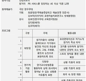 기업 컨설팅 및 실행사업 썸네일형 리스트형 4. 직무교육 프로그램 - 프리젠테이션 씨어터 (1) 인컴브로더 Presentation Theater 프리젠테이션 씨어터 Background 인컴브로더는 다국적 PR전문회사로 프리젠테이션을 통해 업무를 수주하는 비즈니스 구조를 갖고 있다. 따라서 직원 개개인의 프리젠테이션 역량이 비즈니스에 직접적인 영향을 주는데 반해, 프리젠테이션 교육은 강의 혹은 비디오 테스트 정도로 간헐적으로 이뤄지고 있었다. 프리젠테이션은 단순한 스킬이 아니라, 개인 내면에 축적된 자신감과 표현력의 발산이기에 프리젠테이션 교육을 효과적으로 진행하기 위해서는 보다 본질적인 내적 변화를 필요로 한다. 프리젠테이션 씨어터는 예술이 기업의 업무에 실질적이고 직접적인 영향을 주도록 설계된 예술교육 프로그램으로, 직원들의 자신감, 표현의 다양성, 관찰력, 대처능력 등을 함양하여 궁극적으.. 더보기 이전 1 ··· 29 30 31 32 33 다음